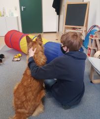 Andererseits reagiert er mit Gleichgültigkeit, wenn die Schüler nicht „ordentlich“ mit ihm kommunizieren. Bei zu cooler Ansprache kann er manchem Kind auch die kalte Schulter zeigen. Besonders verhält er sich, wenn sich Kinder streiten. Dann möchte er gerne schlichten und kann sich lautstark bemerkbar machen. Gemeinsam arbeiten „Murphy“ und ich mit den Kindern zumeist in Einzelsituationen. Mal aktiv im gemeinsamen Spiel, mal reaktiv abwartend und empathisch auf die Befindlichkeiten der Kinder eingehend.